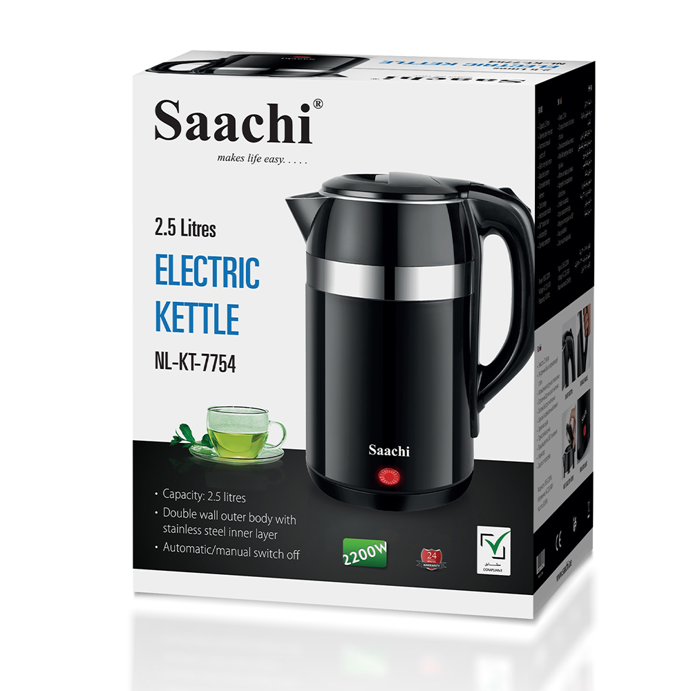 Saachi Electric Kettle NL-KT-7754 is a smart and efficient appliance for everyday use. The inner water level indicators allow you to easily analyze how much water has been entered into the kettle. The automatic shut-off function turns off the appliance once the water has been boiled. The kettle has a detachable cord. Finally, the elegant black and steel design makes it a great appliance to have in your kitchen.