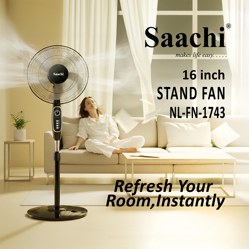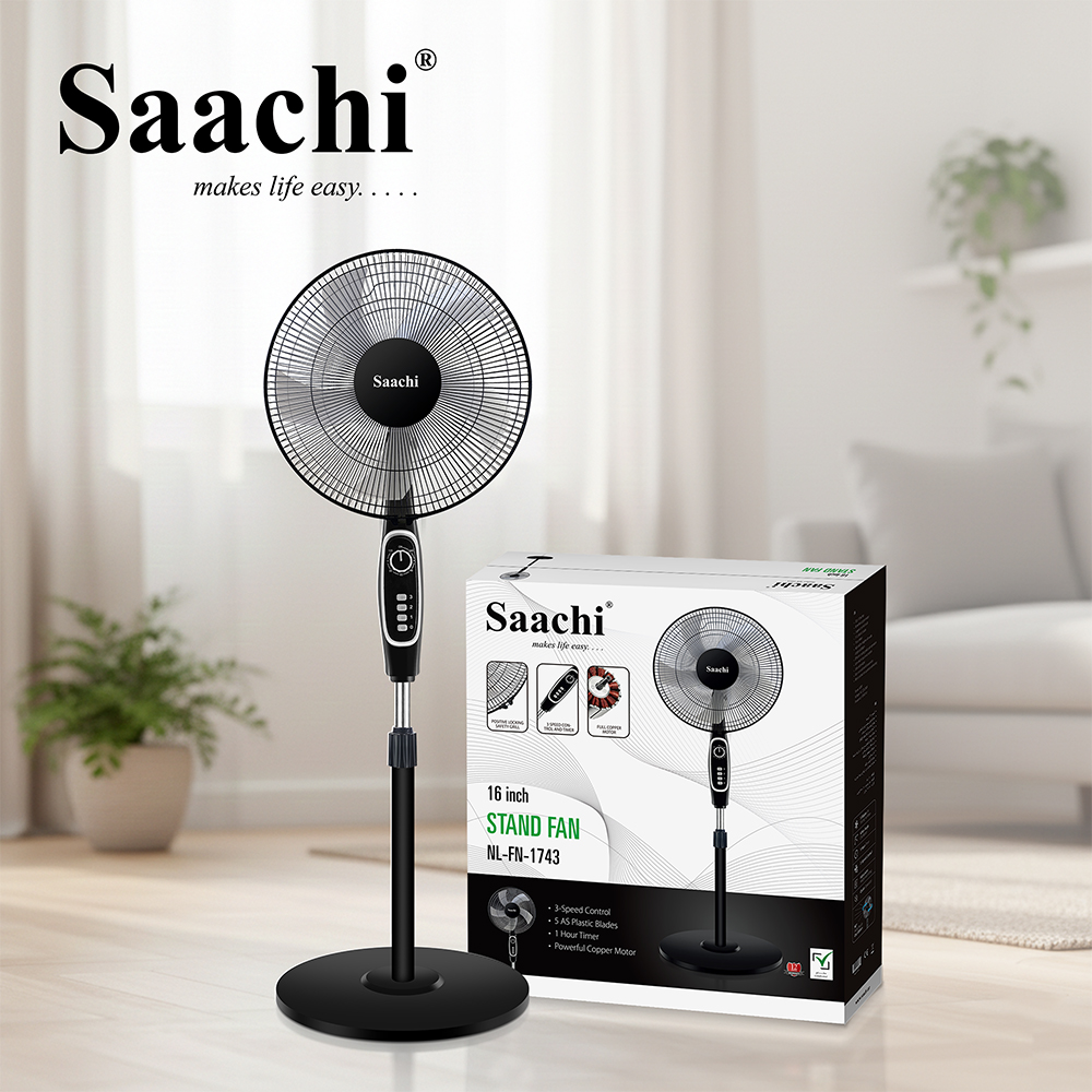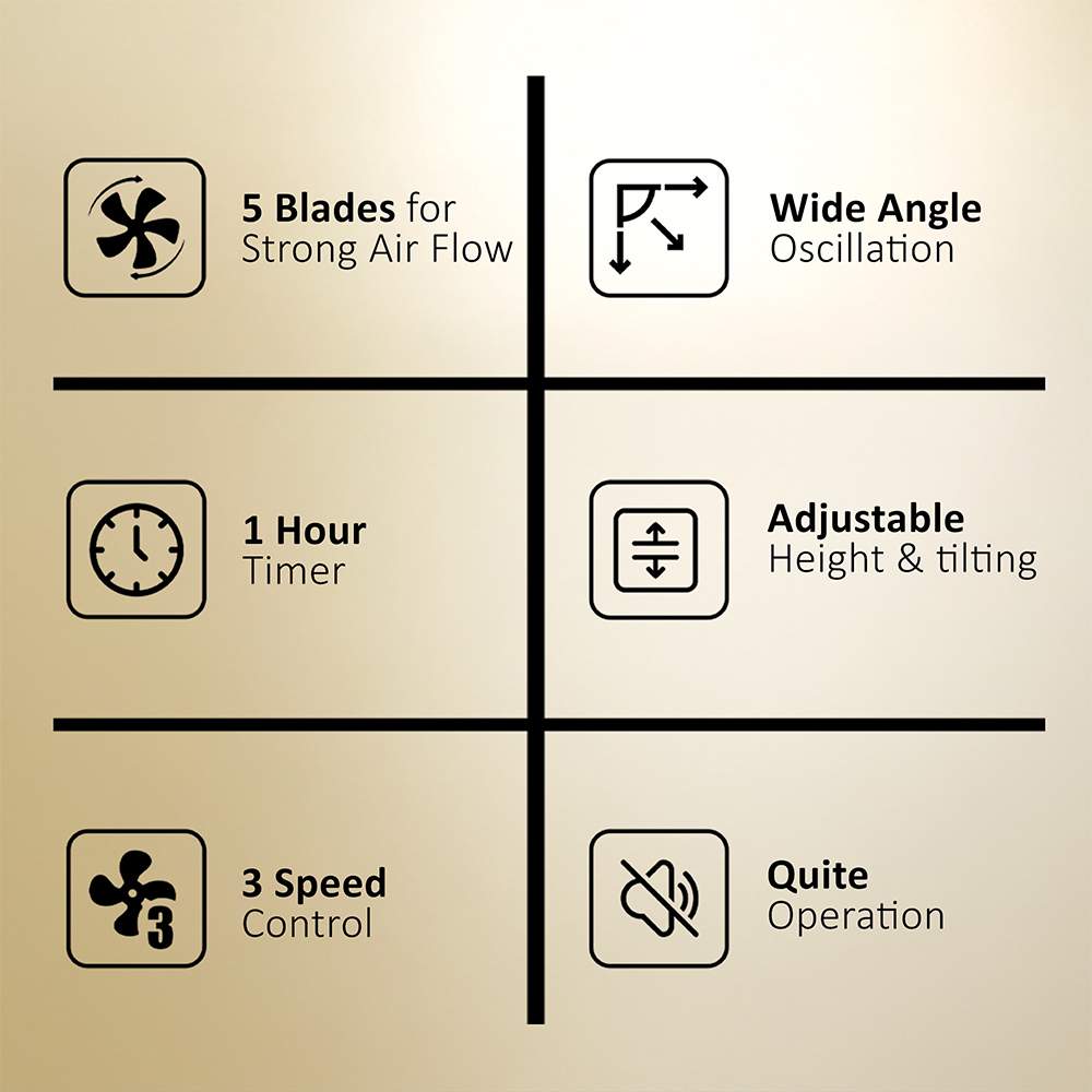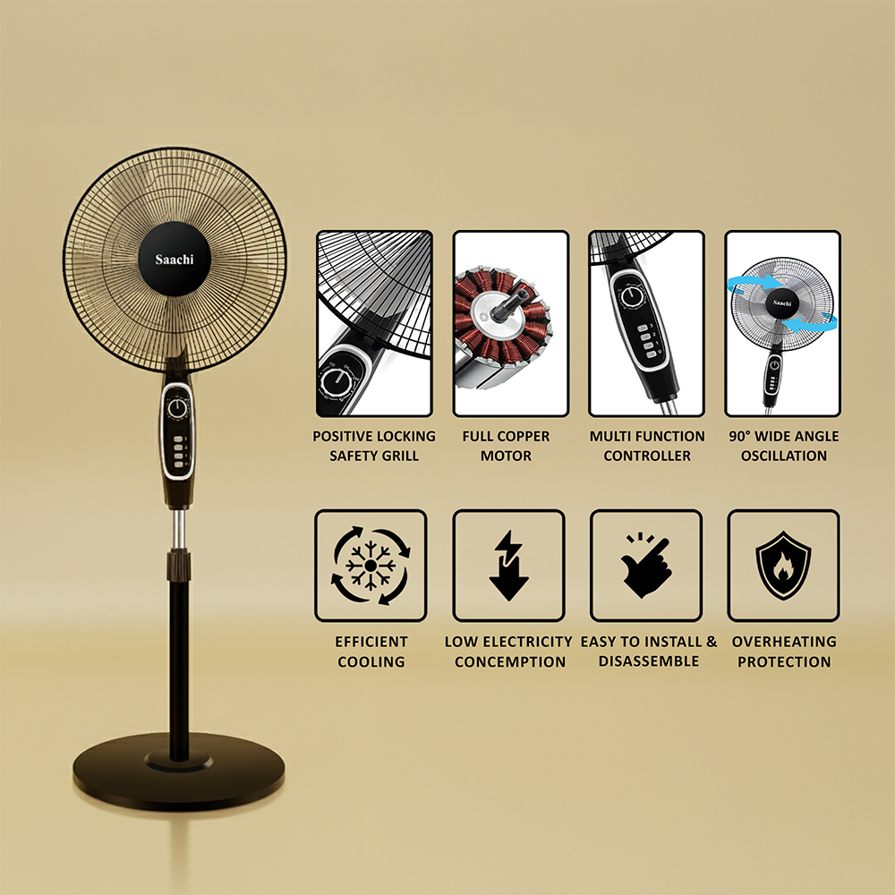 This 16-inch stand fan combines style and performance with a powerful copper motor, 3-speed settings, and 5 durable AS plastic blades. Designed for efficient, quiet cooling, it features a 1-hour timer, adjustable height, wide-angle oscillation, and motor overheating protection—all with low energy consumption and easy assembly.