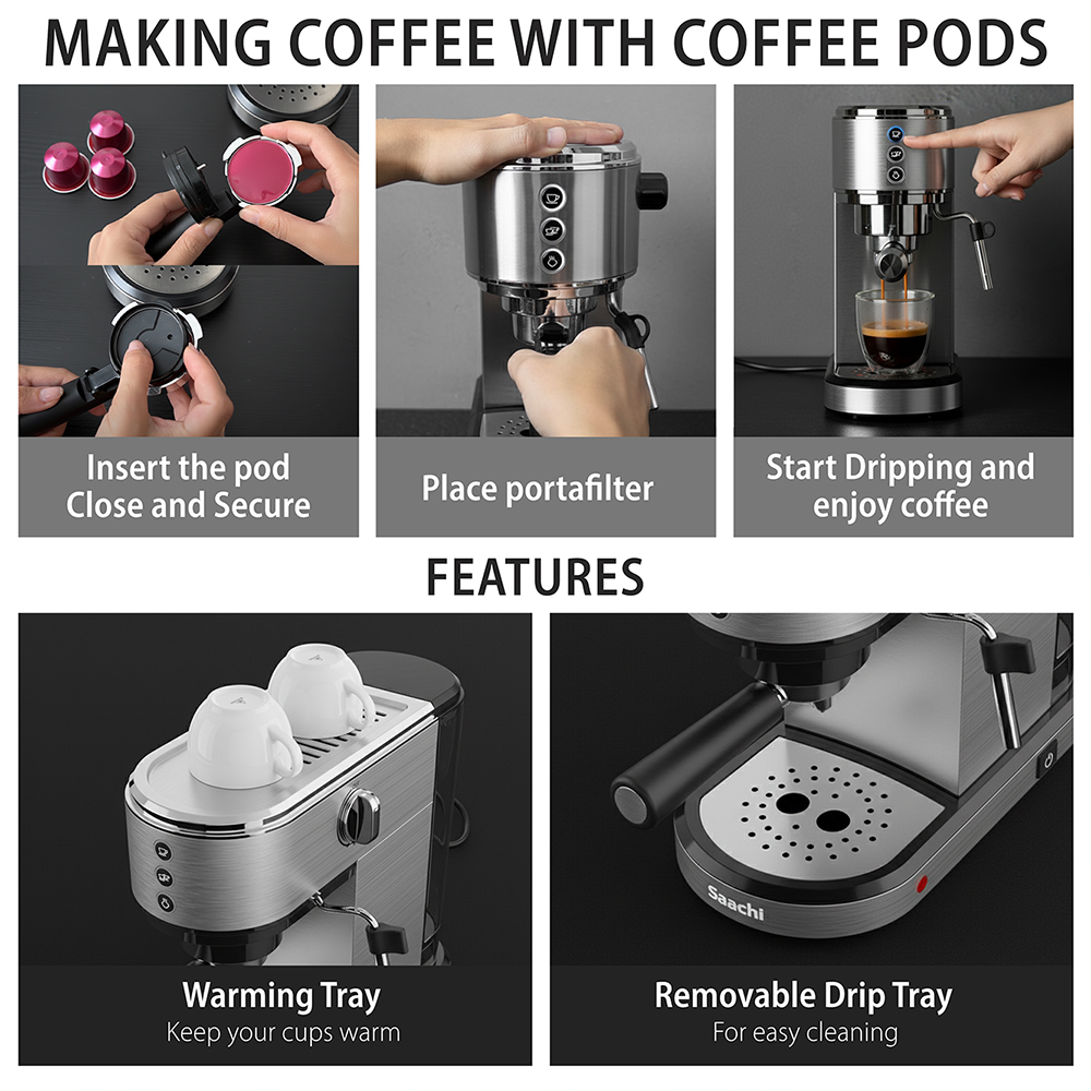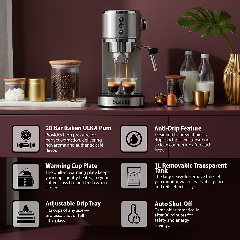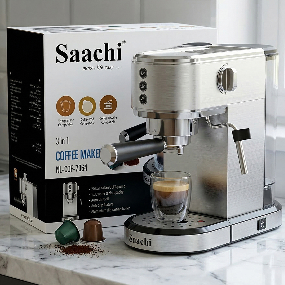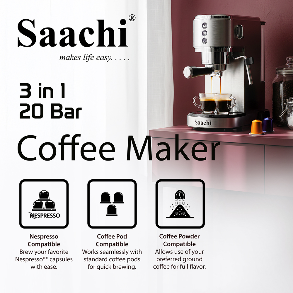 The next generation of coffee makers is finally here. The Saachi 3 in 1 Coffee Maker can make all your favourite types of coffee with ease. The appliance can be used with store-bought coffee capsules containing a variety of flavors or can also be used with regular coffee powder. This appliance is compatible with both Nespresso and Coffee pod making it one of the most convenient coffee makers in the market today. It has a 20 bar Italian ULKA pressure pump and a 1.0 litre water tank capacity.