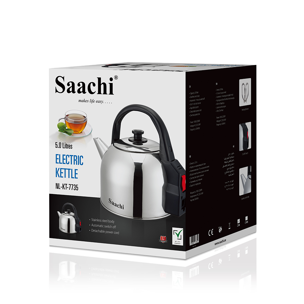 Saachi Electric Kettle NL-KT-7735 is a smart and efficient appliance for everyday use. The inner water level indicators allow you to easily analyze how much water has been entered into the kettle. The automatic shut-off function turns off the appliance once the water has been boiled. The kettle has a detachable power cord. Finally, the elegant black and steel design makes it a great appliance to have in your kitchen.