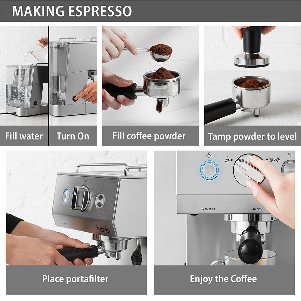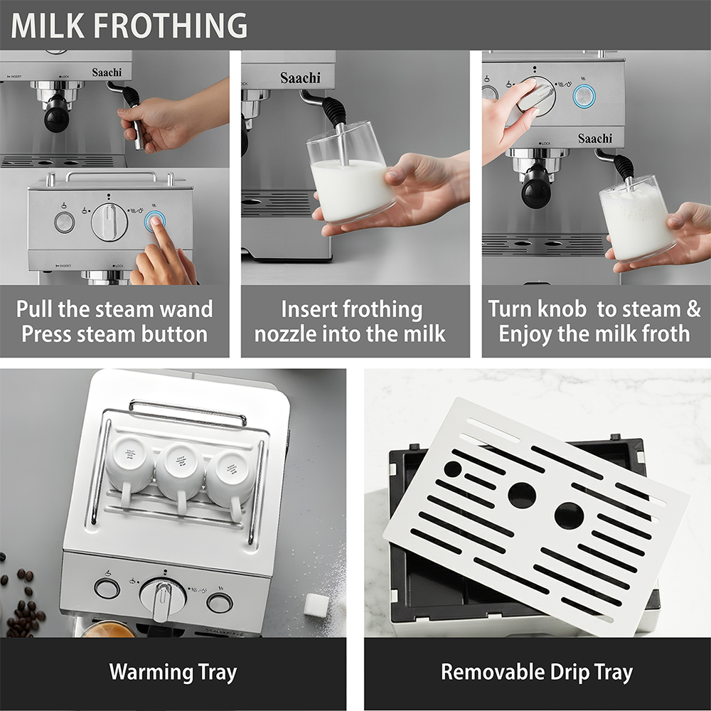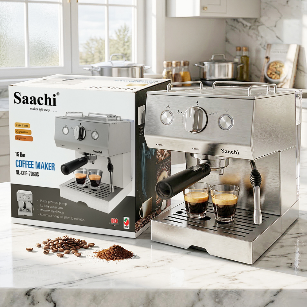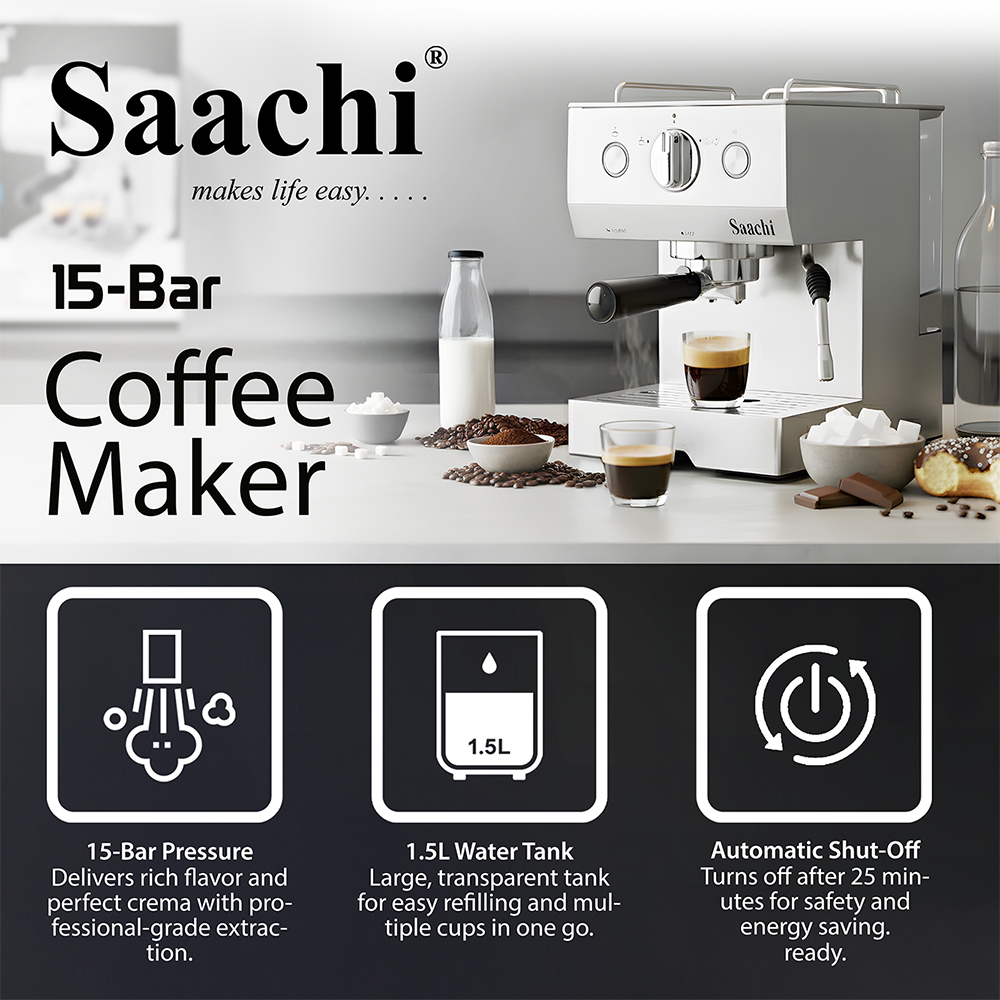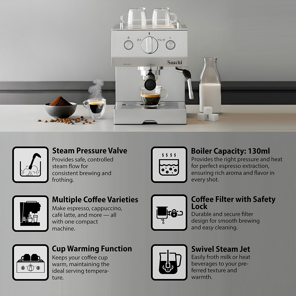Bored of plain old coffee? Looking for a little more variety? You got it! The new Saachi coffee maker NL-COF-7060S can make many different styles of coffee including espresso, cappuccino, café latte and many others. The steam nozzle allows you complete control over the amount of froth you desire in your coffee. it has a automatically turns off function if not used for 25 minutes. The keep-warm tray on top of the appliance allows you to keep a cup of coffee warm while you prepare to make another one, handy when entertaining guests.