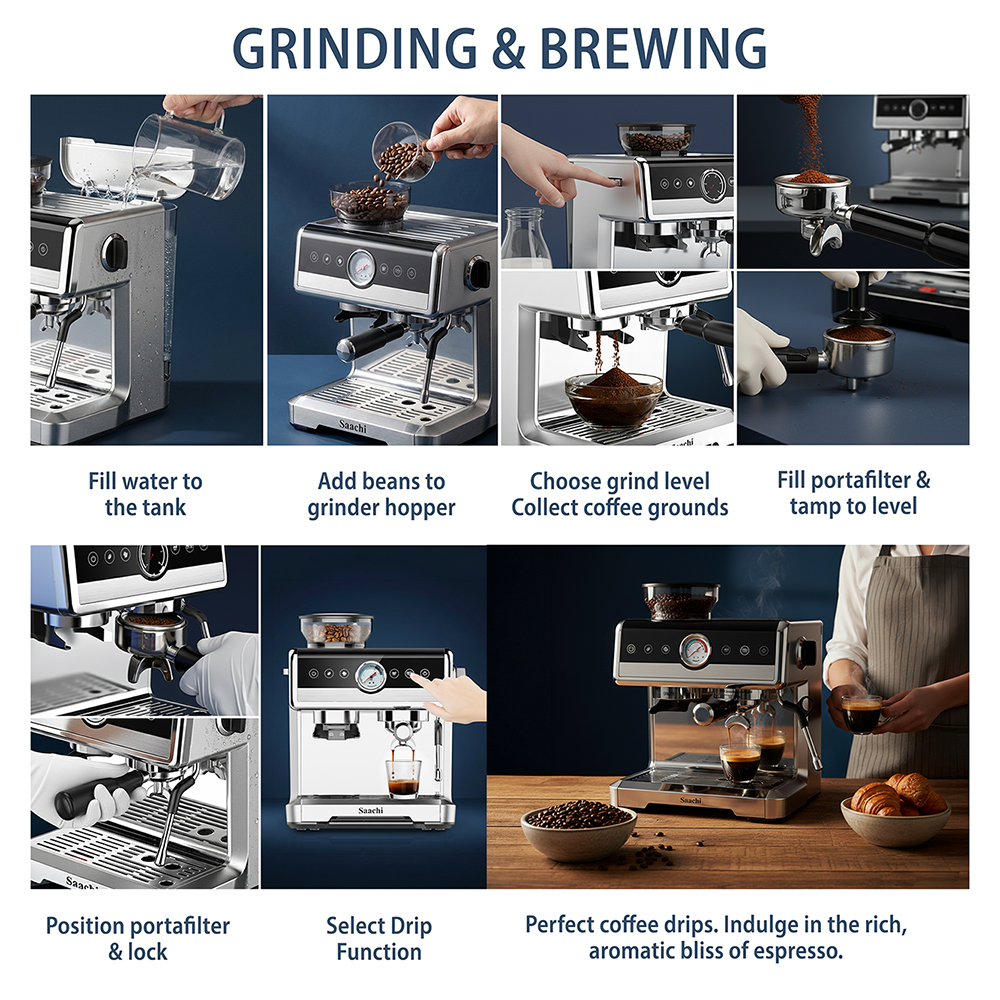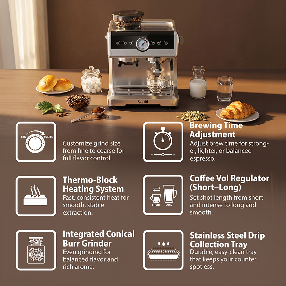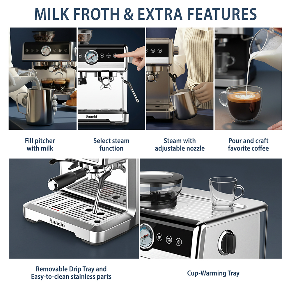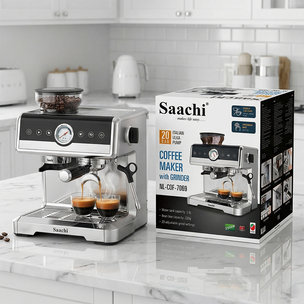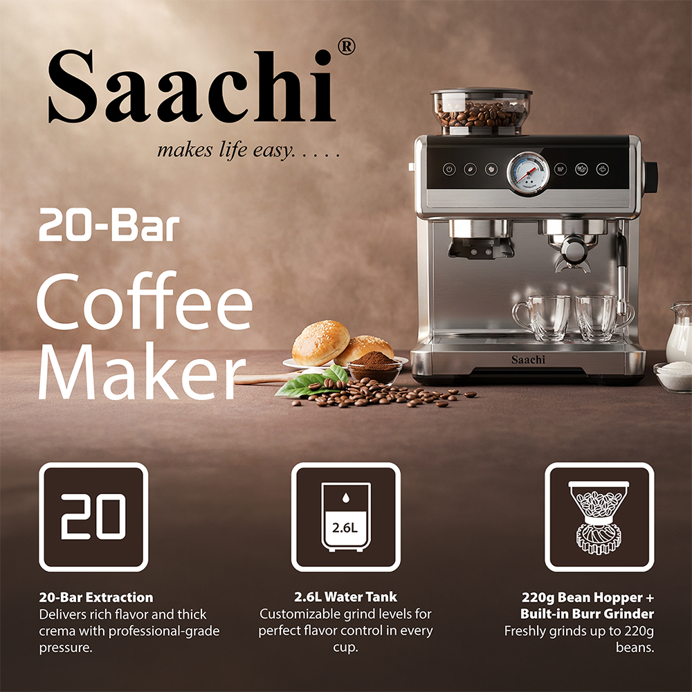Bored of plain old coffee? Looking for a little more variety? You got it! The new Saachi coffee maker NL-COF-7069 can make many different styles of coffee including espresso, cappuccino, and many others with 20 grinding grade settings. The steam nozzle allows you complete control over the amount of froth you desire in your coffee. The included grinder on top will save you space and a trip to the store for an additional coffee grinder. The keep-warm tray on top of the appliance allows you to keep a cup of coffee warm while you prepare to make another one, handy when entertaining guests.
