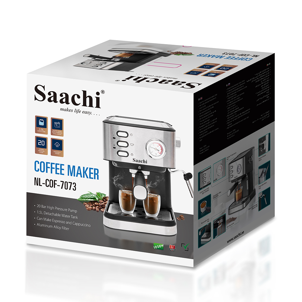 The Saachi NL-COF-7073 Coffee Maker is a must-have for coffee enthusiasts, offering the versatility to craft a variety of beverages such as espresso and cappuccino. Featuring a 20 Bar automatic steam pressure pump, a swivel steam jet for perfect milk frothing, and a transparent 1.5L removable water tank, this coffee maker ensures top-notch quality and convenience. Its plastic body with a durable stainless steel outer cover, warming cup plate, and user-friendly manual buttons make it a versatile and stylish addition to any kitchen.