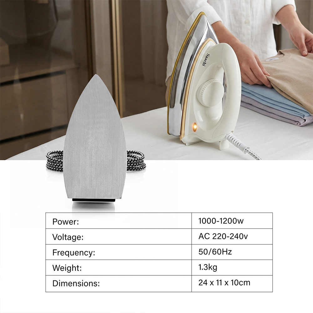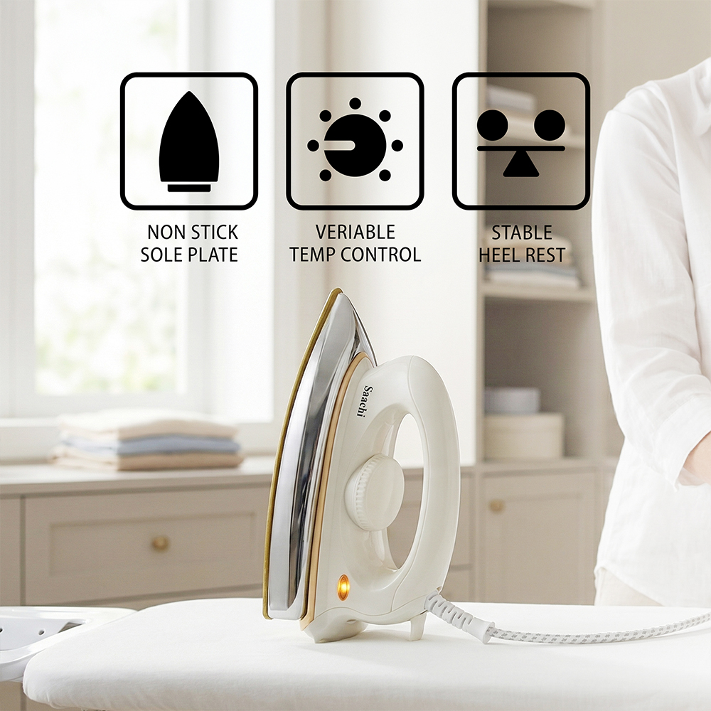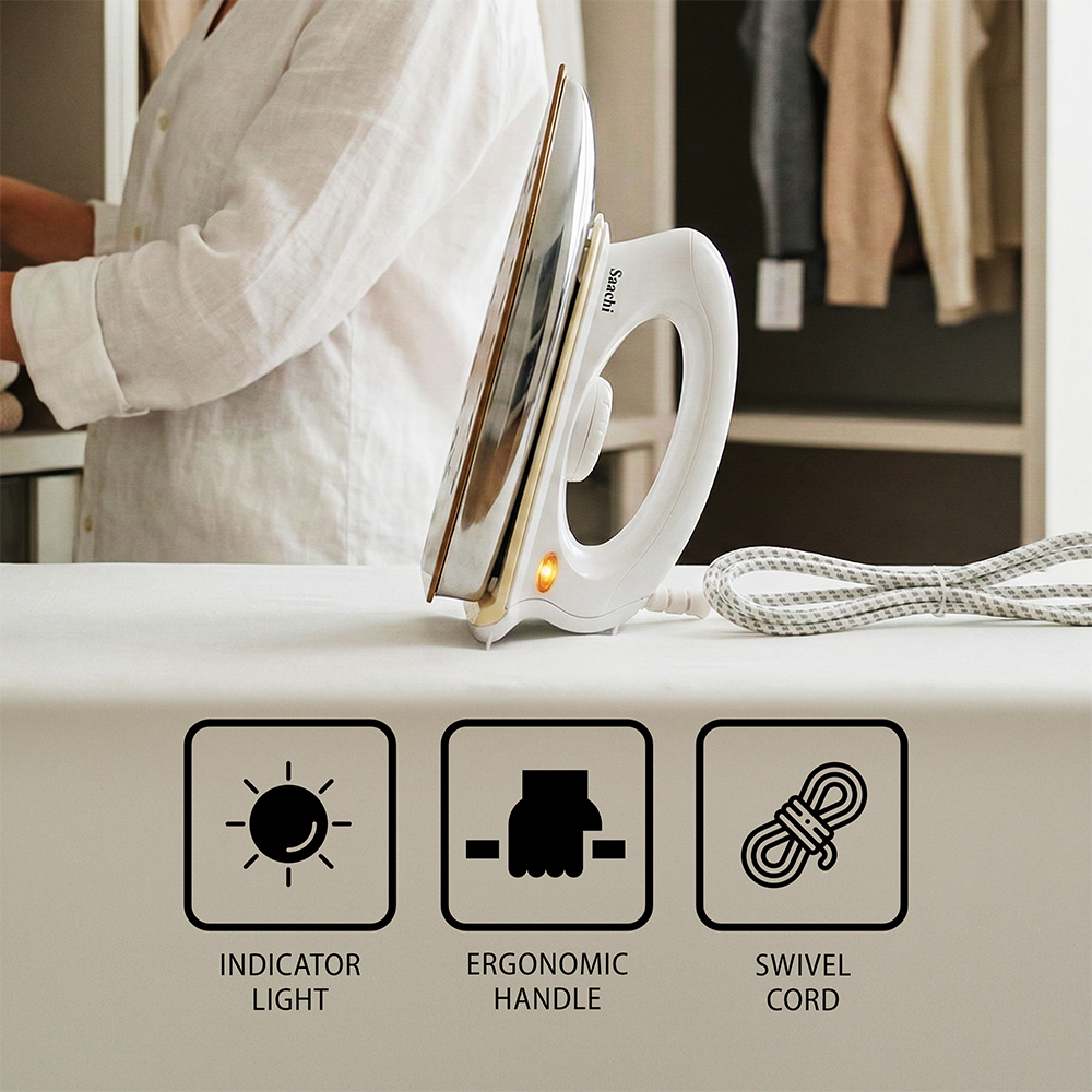 This iron features a non-stick soleplate for smooth and effortless ironing. It comes with thermostat and adjustable temperature control to suit different fabrics. The overheat protection ensures safe operation, while the pilot indicator light shows when the iron is powered on. A swivel cord provides easy movement, and the stable heel rest offers secure placement during use.