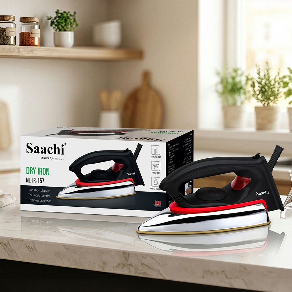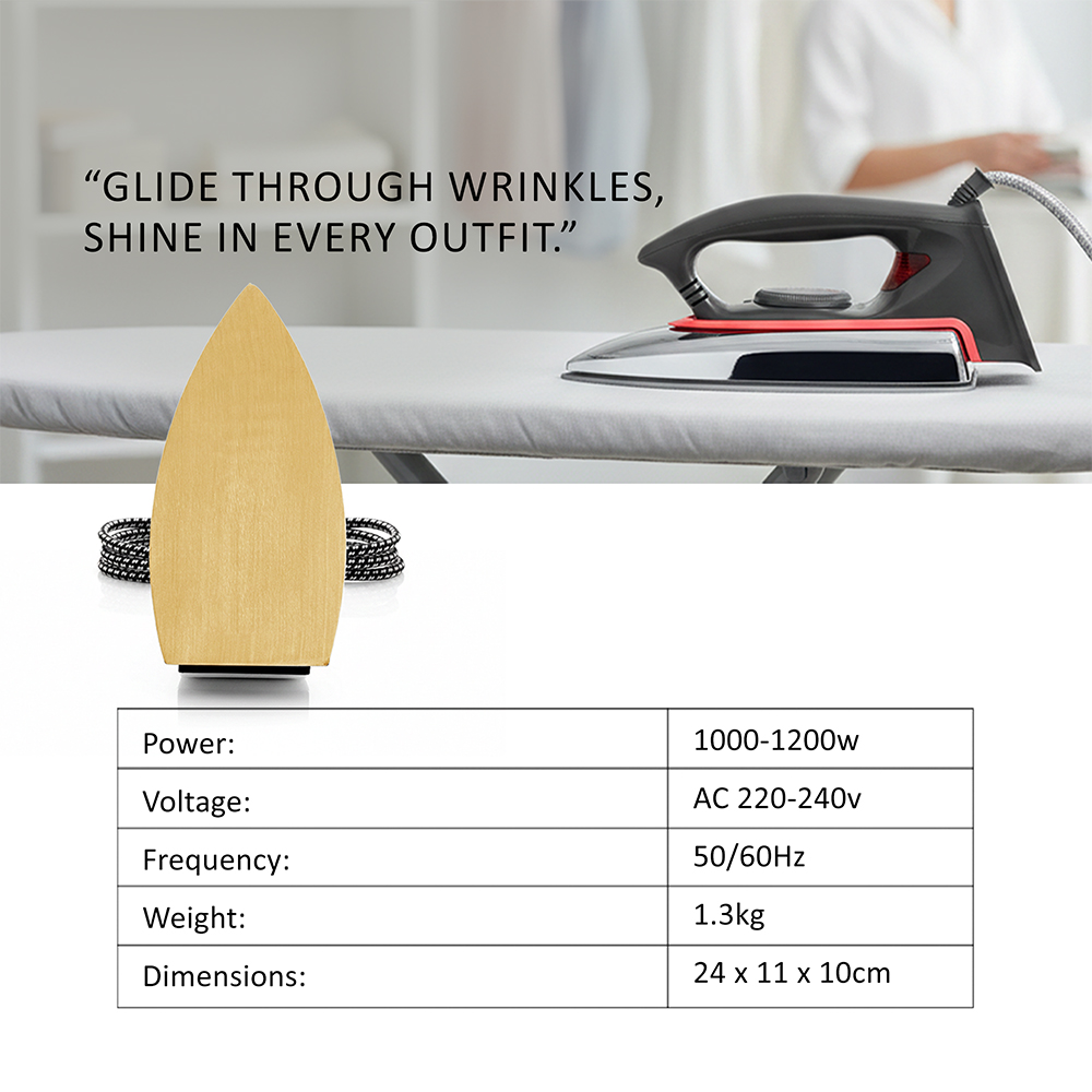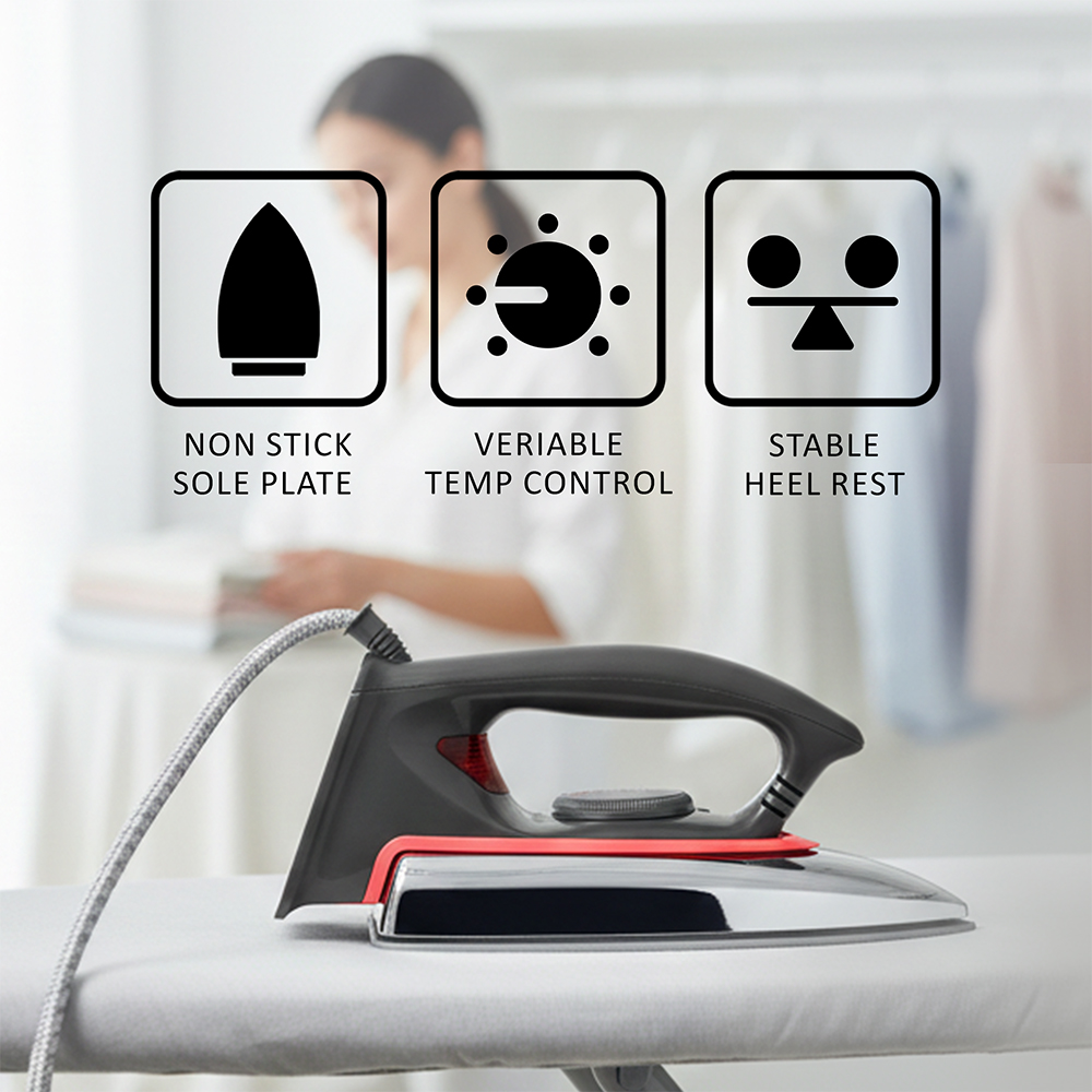 This iron features a non-stick soleplate for smooth and effortless ironing. It includes thermostat and adjustable temperature control to suit different fabric types. The indicator light provides clear power status, while overheat protection ensures safe use. A swivel cord allows easy and flexible movement during ironing.