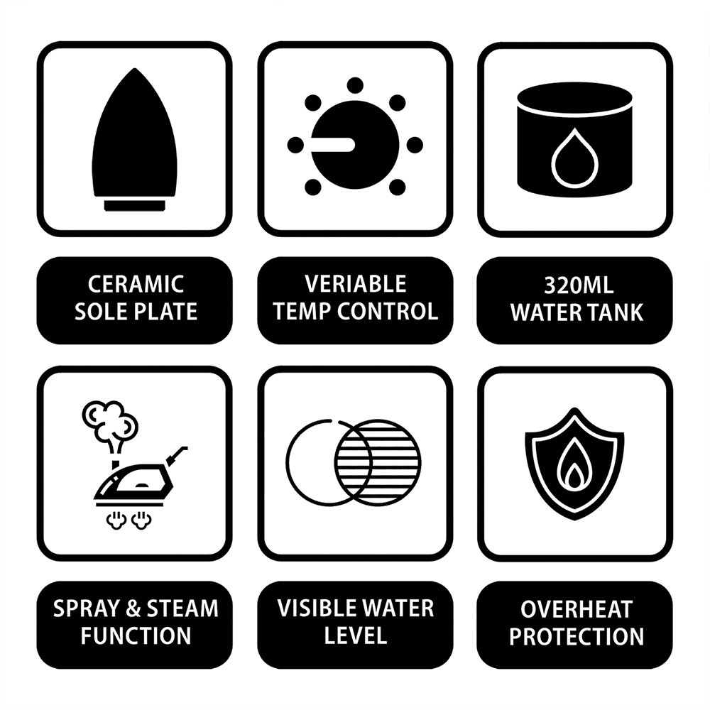 Designed with a smooth ceramic soleplate for easy glide, this steam iron features adjustable temperature and variable steam control to suit every fabric. The powerful burst and spray functions remove stubborn wrinkles in seconds, while the self-clean feature ensures long-lasting performance. With a large 320ml water tank, 360° swivel cord, and built-in overheat protection, it delivers safe, convenient, and professional results every time.