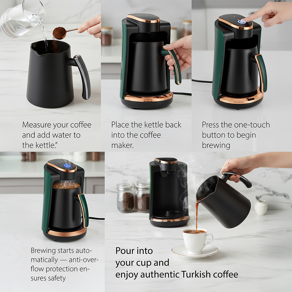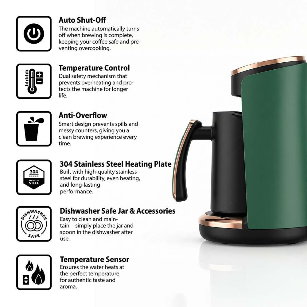 Enjoy rich, authentic flavors with this versatile coffee maker, designed for convenience and efficiency. With a 250ml water tank, it can prepare up to 4 cups of traditional Turkish coffee in just 5 minutes. The easy-to-use control knob with indicator lights lets you select the perfect number of cups, while the automatic shut-off ensures safe, hassle-free brewing. Its anti-overflow function adds extra reliability, and the included measuring spoon helps you get the perfect taste every time. Plus, the jar and accessories are dishwasher safe, making cleanup quick and effortless.